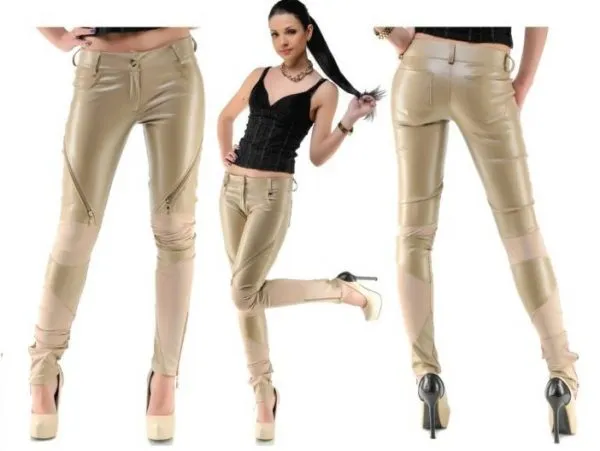 - 肌。 Модные кожаные брюки — тренд сезона. И они не обязательно должны быть черными. Поэтому сейчас дизайнеры предлагают освежить свой гардероб кожаными вещами разных оттенков. Конечно, среди них есть и бежевый. Кожаные брюки бежевого цвета выглядят очень сексуально, особенно если они плотно облегают фигуру.