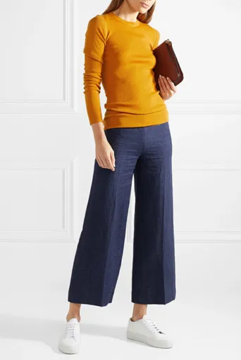 Шорты и брюки с широкими штанинами выглядят нелепо с толстыми кроссовками. Кроссовки с тонкой подошвой, кроссовки из мягкой кожи с застежками-липучками и простые сникерсы лучше всего подходят под брюки-кюлоты.