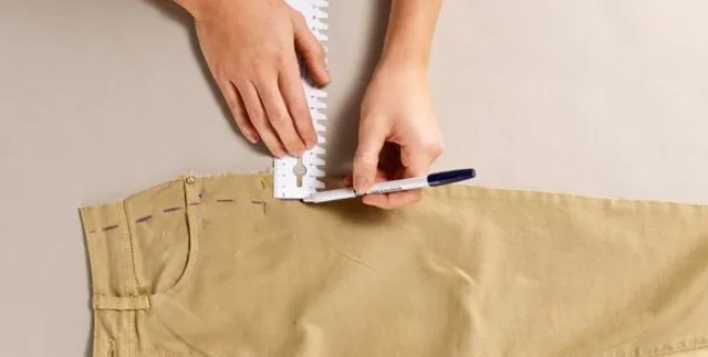 Если вам нужно значительно уменьшить размер брюк — например, на два или более размера — вам нужно будет сшить внешние и внутренние швы. Процедура такая же, как и при разрезании вдоль шва, но просто разделите измерение на два.