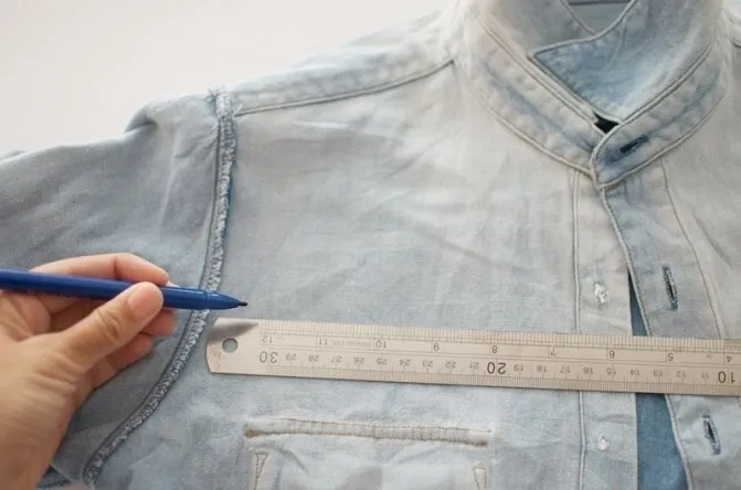 - Сначала определите новую длину изделия. Отступите от края детали на расстояние планируемого разреза и отметьте мелом линию на новом крае куртки. От этой линии нужно отступить еще 2 дюйма, которые понадобятся для подшивки.