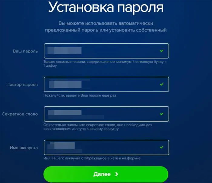 - Придумайте пароль и установите его дважды, введите секретное слово и имя учетной записи, чтобы оно было свободным, и нажмите «Далее»: