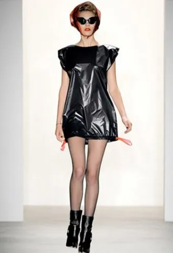 Из мусорных пакетов можно сделать отличный вечерний наряд с юбкой чирлидерши. Верхней частью наряда может быть простая блузка в тон целлофану или сама сумка с вырезом для рук и декольте. В этом случае верх платья должен быть подогнан непосредственно к модели.