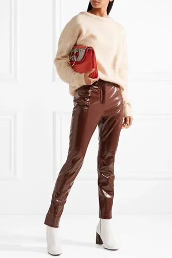 Кожаные леггинсы в коричневых тонах можно носить с объемными вещами. Кожа прекрасно гармонирует с трикотажем, мехом и джинсами. К вещам белого, пудрового, темно-коричневого тонов подходят брюки кирпичных тонов.