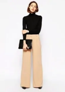 - Брюки с завышенной талией. Оригинальный образ создаем с помощью брюк с завышенной талией рыже-коричневого цвета, верх подбираем в одной цветовой гамме с низом. В данном случае бежевую блузку без рукавов. Из обуви – ботильоны на танкетке. Разбавим образ черными аксессуарами – черный ремешок, сумка, очки в черной оправе.