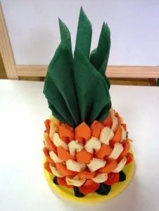 Таким же образом можно сделать держатель для салфеток в форме ананаса. Верхняя часть — зеленый лист — рабочая салфетка, нижняя часть — держатель.
