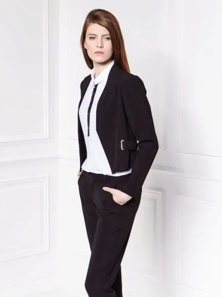 ズボン。 Короткий жакет — идеальное дополнение к паре узких брюк с блузкой или кофтой. Если вещи выполнены в одном цвете, у вас может получиться очень элегантный, строгий наряд, идеально подходящий для офисного дресс-кода. Сочетание короткого жакета и брюк, выполненных из легкой, струящейся ткани, выглядит очень эффектно.
