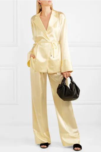 - Атласный комплект (блуза до линии талии + брюки на поясе).